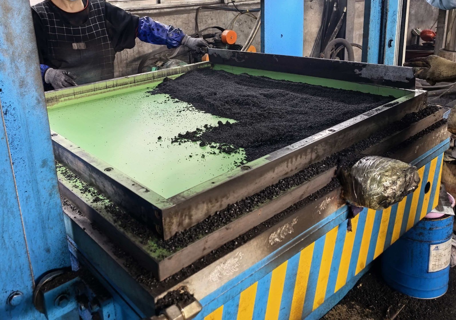 The mixed compound is then weighed and transferred into molds. Using compression molding techniques, the material is shaped under high pressure to form the tile’s specific dimensions and surface texture (e.g., flat, studded, or interlocking patterns).
