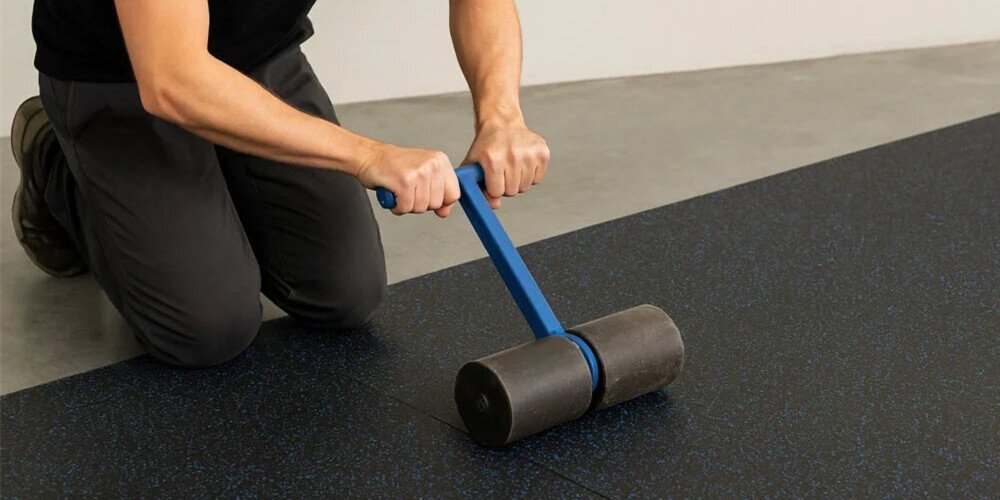 Secure Seams (Glue Method) - Fold back half the roll, apply adhesive with a notched trowel, lay the rubber into the wet glue, and immediately roll it with the heavy roller. Repeat for the other half.